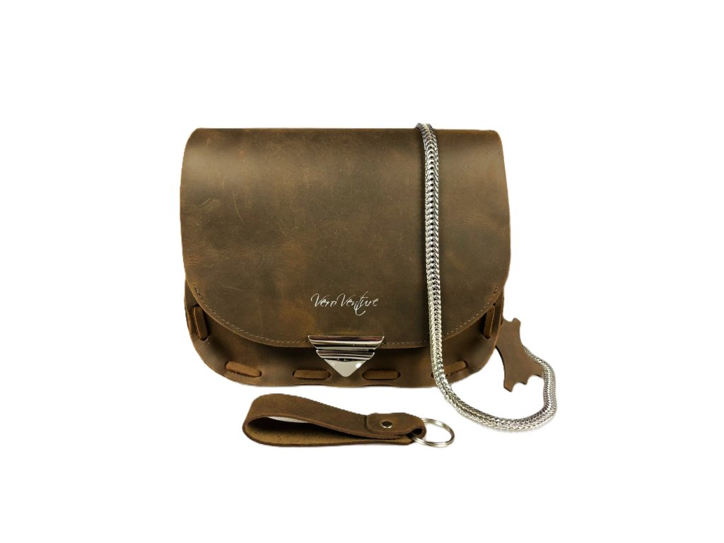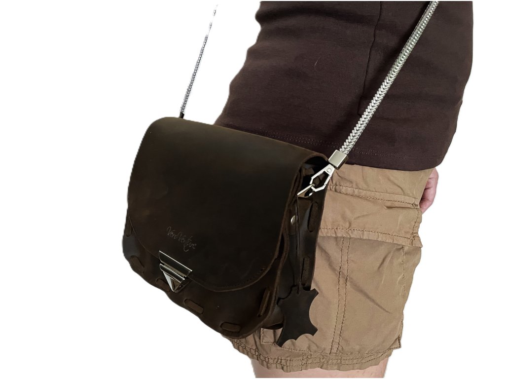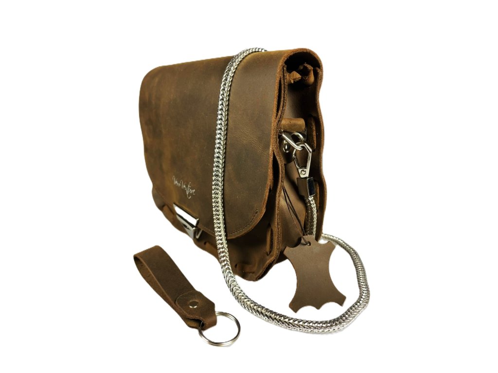 Když se skloubí historie se současností, vznikne originální dámská kabelka. Kůže hovězí crazy horse, sešitá koženou šňůrkou. Zapínaní stříbrné barvy a popruh masivní pevný řetízek s karabinkami. Rozměry: š-200mm x V-170mm x hl. 50mm. Zdarma ke kabelce klíčenka.